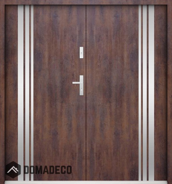 De deur is gemaakt van roestvrij staal. Binnenin is het gevuld met PUR-polyurethaanschuim en hout. De dikte van het deurblad is 55mm. Dubbel afdichtingssysteem - één afdichting bevindt zich in de opening van het kozijn en de andere bevindt zich in het ondersteunende deel van het deurblad. Dit vermindert trillingen en beschermt jouw huis tegen warmteverlies. Het volume verandert niet vonder invloed van atmosferische omstandigheden. Het kozijn heeft in de scharnierdelen en de vergrendelingspunten anti-inbraakversterkingen.