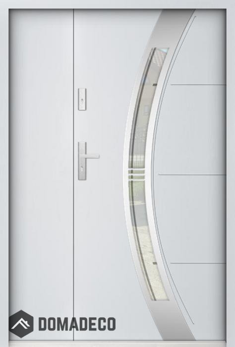 De deur is gemaakt van roestvrij staal. Binnenin is het gevuld met PUR-polyurethaanschuim en hout. De dikte van het deurblad is 55mm. Dubbel afdichtingssysteem - één afdichting bevindt zich in de opening van het kozijn en de andere bevindt zich in het ondersteunende deel van het deurblad. Dit vermindert trillingen en beschermt jouw huis tegen warmteverlies. Het volume verandert niet vonder invloed van atmosferische omstandigheden. Het kozijn heeft in de scharnierdelen en de vergrendelingspunten anti-inbraakversterkingen.
