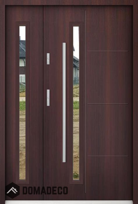 De deur is gemaakt van roestvrij staal. Binnenin is het gevuld met PUR-polyurethaanschuim en hout. De dikte van het deurblad is 55mm. Dubbel afdichtingssysteem - één afdichting bevindt zich in de opening van het kozijn en de andere bevindt zich in het ondersteunende deel van het deurblad. Dit vermindert trillingen en beschermt jouw huis tegen warmteverlies. Het volume verandert niet vonder invloed van atmosferische omstandigheden. Het kozijn heeft in de scharnierdelen en de vergrendelingspunten anti-inbraakversterkingen.