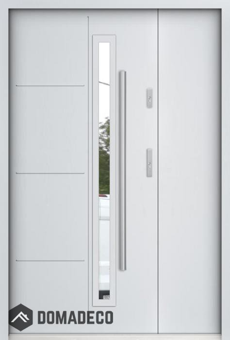 De deur is gemaakt van roestvrij staal. Binnenin is het gevuld met PUR-polyurethaanschuim en hout. De dikte van het deurblad is 55mm. Dubbel afdichtingssysteem - één afdichting bevindt zich in de opening van het kozijn en de andere bevindt zich in het ondersteunende deel van het deurblad. Dit vermindert trillingen en beschermt jouw huis tegen warmteverlies. Het volume verandert niet vonder invloed van atmosferische omstandigheden. Het kozijn heeft in de scharnierdelen en de vergrendelingspunten anti-inbraakversterkingen.