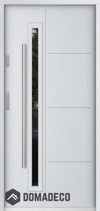De deur is gemaakt van roestvrij staal. Binnenin is het gevuld met PUR-polyurethaanschuim en hout. De dikte van het deurblad is 55mm. Dubbel afdichtingssysteem - één afdichting bevindt zich in de opening van het kozijn en de andere bevindt zich in het ondersteunende deel van het deurblad. Dit vermindert trillingen en beschermt jouw huis tegen warmteverlies. Het volume verandert niet vonder invloed van atmosferische omstandigheden. Het kozijn heeft in de scharnierdelen en de vergrendelingspunten anti-inbraakversterkingen.