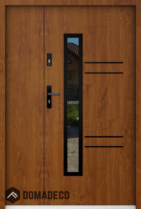 De deur is gemaakt van roestvrij staal. Binnenin is het gevuld met PUR-polyurethaanschuim en hout. De dikte van het deurblad is 55mm. Dubbel afdichtingssysteem - één afdichting bevindt zich in de opening van het kozijn en de andere bevindt zich in het ondersteunende deel van het deurblad. Dit vermindert trillingen en beschermt jouw huis tegen warmteverlies. Het volume verandert niet vonder invloed van atmosferische omstandigheden. Het kozijn heeft in de scharnierdelen en de vergrendelingspunten anti-inbraakversterkingen.