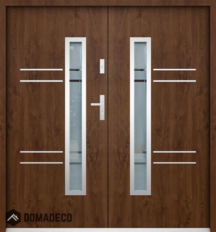 De deur is gemaakt van roestvrij staal. Binnenin is het gevuld met PUR-polyurethaanschuim en hout. De dikte van het deurblad is 55mm. Dubbel afdichtingssysteem - één afdichting bevindt zich in de opening van het kozijn en de andere bevindt zich in het ondersteunende deel van het deurblad. Dit vermindert trillingen en beschermt jouw huis tegen warmteverlies. Het volume verandert niet vonder invloed van atmosferische omstandigheden. Het kozijn heeft in de scharnierdelen en de vergrendelingspunten anti-inbraakversterkingen.