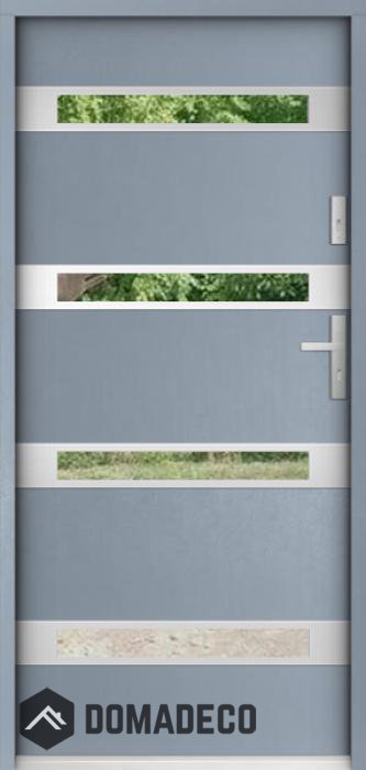 De deur is gemaakt van roestvrij staal. Binnenin is het gevuld met PUR-polyurethaanschuim en hout. De dikte van het deurblad is 55mm. Dubbel afdichtingssysteem - één afdichting bevindt zich in de opening van het kozijn en de andere bevindt zich in het ondersteunende deel van het deurblad. Dit vermindert trillingen en beschermt jouw huis tegen warmteverlies. Het volume verandert niet vonder invloed van atmosferische omstandigheden. Het kozijn heeft in de scharnierdelen en de vergrendelingspunten anti-inbraakversterkingen.