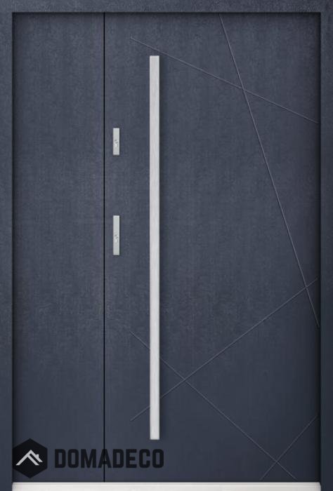 De deur is gemaakt van roestvrij staal. Binnenin is het gevuld met PUR-polyurethaanschuim en hout. De dikte van het deurblad is 55mm. Dubbel afdichtingssysteem - één afdichting bevindt zich in de opening van het kozijn en de andere bevindt zich in het ondersteunende deel van het deurblad. Dit vermindert trillingen en beschermt jouw huis tegen warmteverlies. Het volume verandert niet vonder invloed van atmosferische omstandigheden. Het kozijn heeft in de scharnierdelen en de vergrendelingspunten anti-inbraakversterkingen.