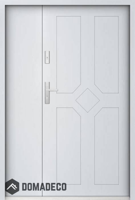 De deur is gemaakt van roestvrij staal. Binnenin is het gevuld met PUR-polyurethaanschuim en hout. De dikte van het deurblad is 55mm. Dubbel afdichtingssysteem - één afdichting bevindt zich in de opening van het kozijn en de andere bevindt zich in het ondersteunende deel van het deurblad. Dit vermindert trillingen en beschermt jouw huis tegen warmteverlies. Het volume verandert niet vonder invloed van atmosferische omstandigheden. Het kozijn heeft in de scharnierdelen en de vergrendelingspunten anti-inbraakversterkingen.