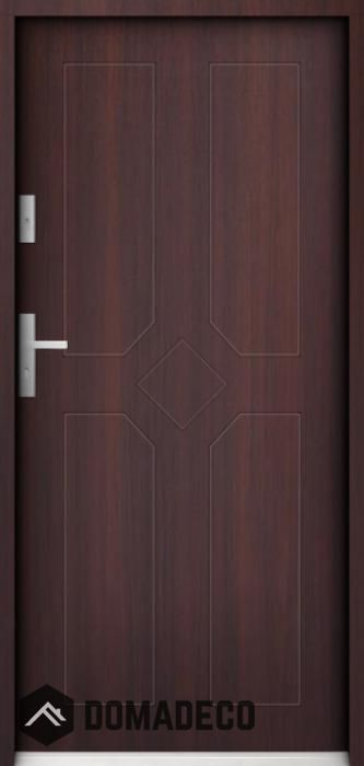 De deur is gemaakt van roestvrij staal. Binnenin is het gevuld met PUR-polyurethaanschuim en hout. De dikte van het deurblad is 55mm. Dubbel afdichtingssysteem - één afdichting bevindt zich in de opening van het kozijn en de andere bevindt zich in het ondersteunende deel van het deurblad. Dit vermindert trillingen en beschermt jouw huis tegen warmteverlies. Het volume verandert niet vonder invloed van atmosferische omstandigheden. Het kozijn heeft in de scharnierdelen en de vergrendelingspunten anti-inbraakversterkingen.
