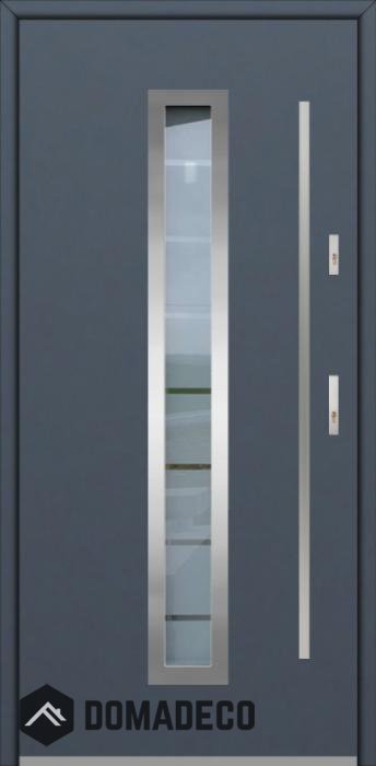 De deur is gemaakt van roestvrij staal. Binnenin is het gevuld met PUR-polyurethaanschuim en hout. De dikte van het deurblad is 64mm. Dubbel afdichtingssysteem - één afdichting bevindt zich in de opening van het kozijn en de andere bevindt zich in het ondersteunende deel van het deurblad. Dit vermindert trillingen en beschermt jouw huis tegen warmteverlies. Het volume verandert niet vonder invloed van atmosferische omstandigheden. Het kozijn heeft in de scharnierdelen en de vergrendelingspunten anti-inbraakversterkingen.