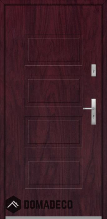 De deur is gemaakt van roestvrij staal. Binnenin is het gevuld met PUR-polyurethaanschuim en hout. De dikte van het deurblad is 64mm. Dubbel afdichtingssysteem - één afdichting bevindt zich in de opening van het kozijn en de andere bevindt zich in het ondersteunende deel van het deurblad. Dit vermindert trillingen en beschermt jouw huis tegen warmteverlies. Het volume verandert niet vonder invloed van atmosferische omstandigheden. Het kozijn heeft in de scharnierdelen en de vergrendelingspunten anti-inbraakversterkingen.