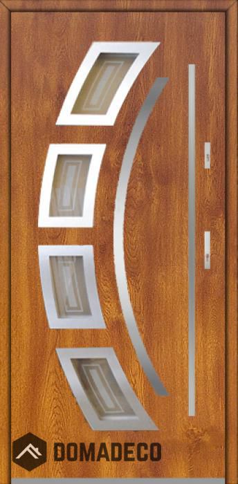 De deur is gemaakt van roestvrij staal. Binnenin is het gevuld met PUR-polyurethaanschuim en hout. De dikte van het deurblad is 64mm. Dubbel afdichtingssysteem - één afdichting bevindt zich in de opening van het kozijn en de andere bevindt zich in het ondersteunende deel van het deurblad. Dit vermindert trillingen en beschermt jouw huis tegen warmteverlies. Het volume verandert niet vonder invloed van atmosferische omstandigheden. Het kozijn heeft in de scharnierdelen en de vergrendelingspunten anti-inbraakversterkingen.