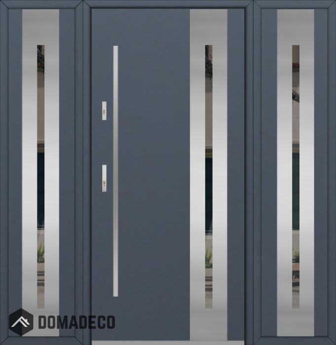 De deur is gemaakt van roestvrij staal. Binnenin is het gevuld met PUR-polyurethaanschuim en hout. De dikte van het deurblad is 54mm. Dubbel afdichtingssysteem - één afdichting bevindt zich in de opening van het kozijn en de andere bevindt zich in het ondersteunende deel van het deurblad. Dit vermindert trillingen en beschermt jouw huis tegen warmteverlies. Het volume verandert niet vonder invloed van atmosferische omstandigheden. Het kozijn heeft in de scharnierdelen en de vergrendelingspunten anti-inbraakversterkingen.