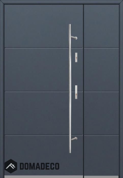 De deur is gemaakt van roestvrij staal. Binnenin is het gevuld met PUR-polyurethaanschuim en hout. De dikte van het deurblad is 54mm. Dubbel afdichtingssysteem - één afdichting bevindt zich in de opening van het kozijn en de andere bevindt zich in het ondersteunende deel van het deurblad. Dit vermindert trillingen en beschermt jouw huis tegen warmteverlies. Het volume verandert niet vonder invloed van atmosferische omstandigheden. Het kozijn heeft in de scharnierdelen en de vergrendelingspunten anti-inbraakversterkingen.