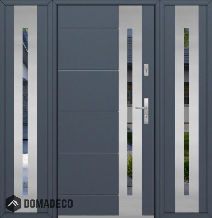De deur is gemaakt van roestvrij staal. Binnenin is het gevuld met PUR-polyurethaanschuim en hout. De dikte van het deurblad is 54mm. Dubbel afdichtingssysteem - één afdichting bevindt zich in de opening van het kozijn en de andere bevindt zich in het ondersteunende deel van het deurblad. Dit vermindert trillingen en beschermt jouw huis tegen warmteverlies. Het volume verandert niet vonder invloed van atmosferische omstandigheden. Het kozijn heeft in de scharnierdelen en de vergrendelingspunten anti-inbraakversterkingen.