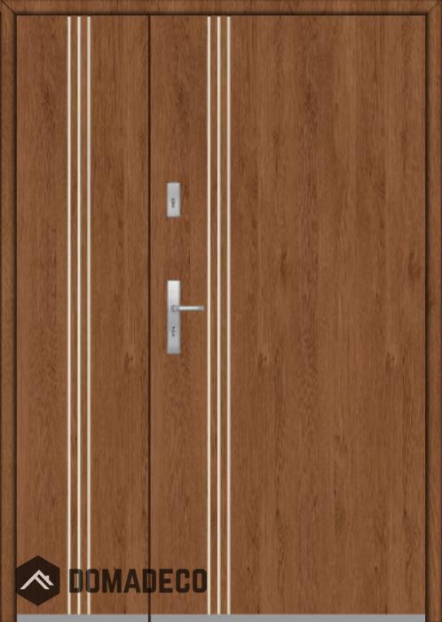 De deur is gemaakt van roestvrij staal. Binnenin is het gevuld met PUR-polyurethaanschuim en hout. De dikte van het deurblad is 54mm. Dubbel afdichtingssysteem - één afdichting bevindt zich in de opening van het kozijn en de andere bevindt zich in het ondersteunende deel van het deurblad. Dit vermindert trillingen en beschermt jouw huis tegen warmteverlies. Het volume verandert niet vonder invloed van atmosferische omstandigheden. Het kozijn heeft in de scharnierdelen en de vergrendelingspunten anti-inbraakversterkingen.