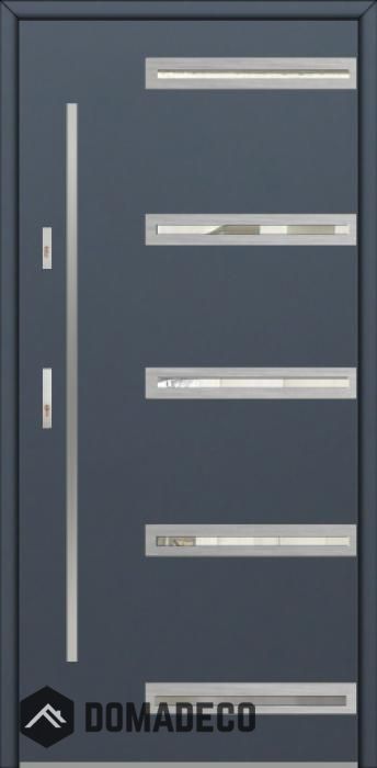 De deur is gemaakt van roestvrij staal. Binnenin is het gevuld met PUR-polyurethaanschuim en hout. De dikte van het deurblad is 64mm. Dubbel afdichtingssysteem - één afdichting bevindt zich in de opening van het kozijn en de andere bevindt zich in het ondersteunende deel van het deurblad. Dit vermindert trillingen en beschermt jouw huis tegen warmteverlies. Het volume verandert niet vonder invloed van atmosferische omstandigheden. Het kozijn heeft in de scharnierdelen en de vergrendelingspunten anti-inbraakversterkingen.