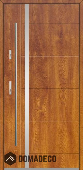 De deur is gemaakt van roestvrij staal. Binnenin is het gevuld met PUR-polyurethaanschuim en hout. De dikte van het deurblad is 64mm. Dubbel afdichtingssysteem - één afdichting bevindt zich in de opening van het kozijn en de andere bevindt zich in het ondersteunende deel van het deurblad. Dit vermindert trillingen en beschermt jouw huis tegen warmteverlies. Het volume verandert niet vonder invloed van atmosferische omstandigheden. Het kozijn heeft in de scharnierdelen en de vergrendelingspunten anti-inbraakversterkingen.