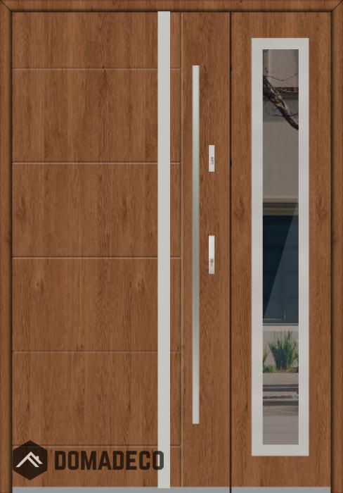 De deur is gemaakt van roestvrij staal. Binnenin is het gevuld met PUR-polyurethaanschuim en hout. De dikte van het deurblad is 54mm. Dubbel afdichtingssysteem - één afdichting bevindt zich in de opening van het kozijn en de andere bevindt zich in het ondersteunende deel van het deurblad. Dit vermindert trillingen en beschermt jouw huis tegen warmteverlies. Het volume verandert niet vonder invloed van atmosferische omstandigheden. Het kozijn heeft in de scharnierdelen en de vergrendelingspunten anti-inbraakversterkingen.