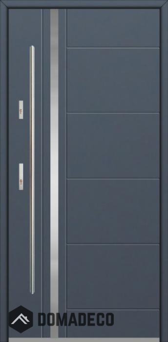 De deur is gemaakt van roestvrij staal. Binnenin is het gevuld met PUR-polyurethaanschuim en hout. De dikte van het deurblad is 64mm. Dubbel afdichtingssysteem - één afdichting bevindt zich in de opening van het kozijn en de andere bevindt zich in het ondersteunende deel van het deurblad. Dit vermindert trillingen en beschermt jouw huis tegen warmteverlies. Het volume verandert niet vonder invloed van atmosferische omstandigheden. Het kozijn heeft in de scharnierdelen en de vergrendelingspunten anti-inbraakversterkingen.