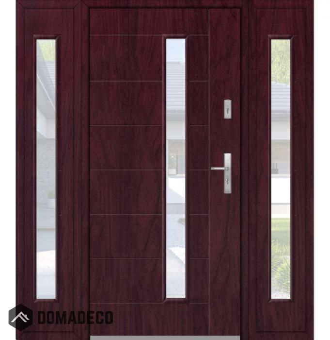 De deur is gemaakt van roestvrij staal. Binnenin is het gevuld met PUR-polyurethaanschuim en hout. De dikte van het deurblad is 54mm. Dubbel afdichtingssysteem - één afdichting bevindt zich in de opening van het kozijn en de andere bevindt zich in het ondersteunende deel van het deurblad. Dit vermindert trillingen en beschermt jouw huis tegen warmteverlies. Het volume verandert niet vonder invloed van atmosferische omstandigheden. Het kozijn heeft in de scharnierdelen en de vergrendelingspunten anti-inbraakversterkingen.
