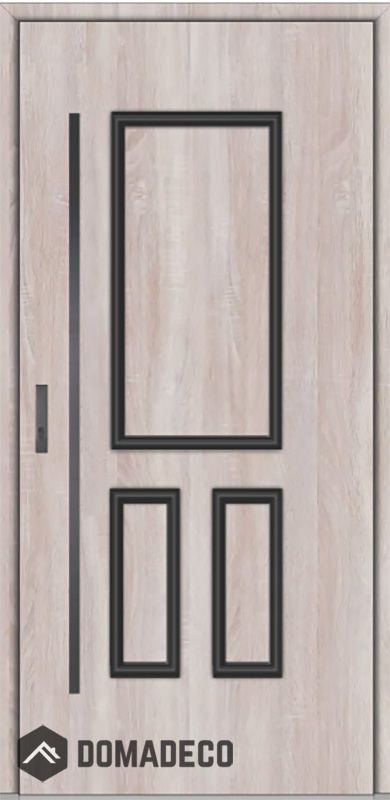 De deur is gemaakt van roestvrij staal. Binnenin is het gevuld met PUR-polyurethaanschuim en hout. De dikte van het deurblad is 64mm. Dubbel afdichtingssysteem - één afdichting bevindt zich in de opening van het kozijn en de andere bevindt zich in het ondersteunende deel van het deurblad. Dit vermindert trillingen en beschermt jouw huis tegen warmteverlies. Het volume verandert niet vonder invloed van atmosferische omstandigheden. Het kozijn heeft in de scharnierdelen en de vergrendelingspunten anti-inbraakversterkingen.