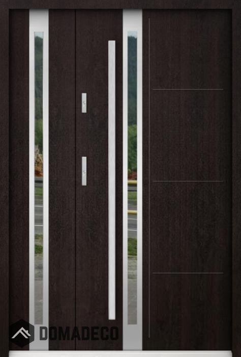 De deur is gemaakt van roestvrij staal. Binnenin is het gevuld met PUR-polyurethaanschuim en hout. De dikte van het deurblad is 55mm. Dubbel afdichtingssysteem - één afdichting bevindt zich in de opening van het kozijn en de andere bevindt zich in het ondersteunende deel van het deurblad. Dit vermindert trillingen en beschermt jouw huis tegen warmteverlies. Het volume verandert niet vonder invloed van atmosferische omstandigheden. Het kozijn heeft in de scharnierdelen en de vergrendelingspunten anti-inbraakversterkingen.