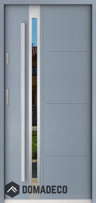 De deur is gemaakt van roestvrij staal. Binnenin is het gevuld met PUR-polyurethaanschuim en hout. De dikte van het deurblad is 55mm. Dubbel afdichtingssysteem - één afdichting bevindt zich in de opening van het kozijn en de andere bevindt zich in het ondersteunende deel van het deurblad. Dit vermindert trillingen en beschermt jouw huis tegen warmteverlies. Het volume verandert niet vonder invloed van atmosferische omstandigheden. Het kozijn heeft in de scharnierdelen en de vergrendelingspunten anti-inbraakversterkingen.