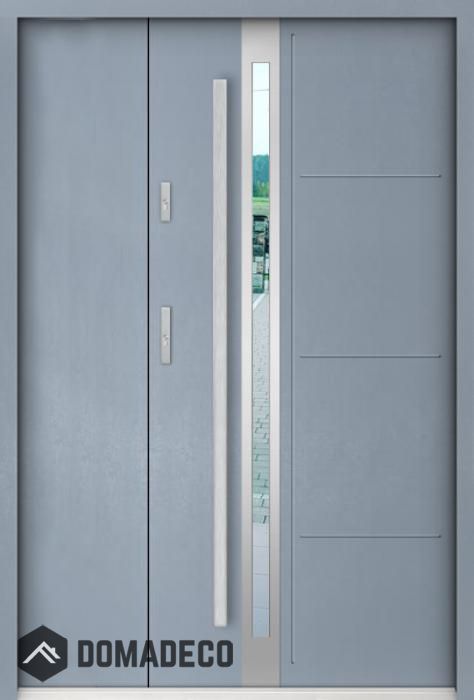 De deur is gemaakt van roestvrij staal. Binnenin is het gevuld met PUR-polyurethaanschuim en hout. De dikte van het deurblad is 55mm. Dubbel afdichtingssysteem - één afdichting bevindt zich in de opening van het kozijn en de andere bevindt zich in het ondersteunende deel van het deurblad. Dit vermindert trillingen en beschermt jouw huis tegen warmteverlies. Het volume verandert niet vonder invloed van atmosferische omstandigheden. Het kozijn heeft in de scharnierdelen en de vergrendelingspunten anti-inbraakversterkingen.