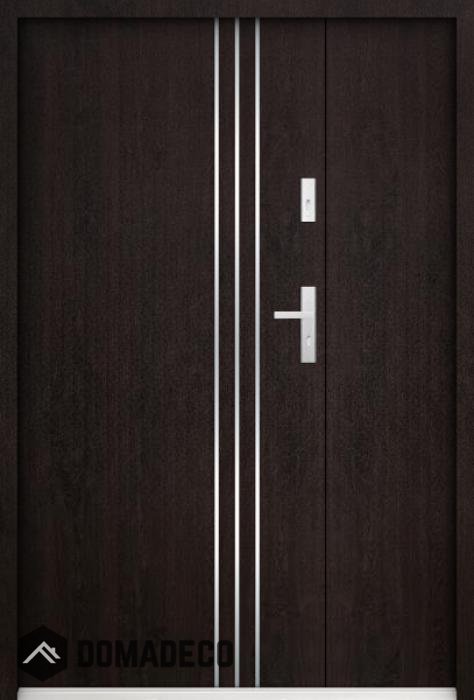De deur is gemaakt van roestvrij staal. Binnenin is het gevuld met PUR-polyurethaanschuim en hout. De dikte van het deurblad is 55mm. Dubbel afdichtingssysteem - één afdichting bevindt zich in de opening van het kozijn en de andere bevindt zich in het ondersteunende deel van het deurblad. Dit vermindert trillingen en beschermt jouw huis tegen warmteverlies. Het volume verandert niet vonder invloed van atmosferische omstandigheden. Het kozijn heeft in de scharnierdelen en de vergrendelingspunten anti-inbraakversterkingen.