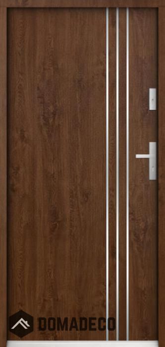 De deur is gemaakt van roestvrij staal. Binnenin is het gevuld met PUR-polyurethaanschuim en hout. De dikte van het deurblad is 55mm. Dubbel afdichtingssysteem - één afdichting bevindt zich in de opening van het kozijn en de andere bevindt zich in het ondersteunende deel van het deurblad. Dit vermindert trillingen en beschermt jouw huis tegen warmteverlies. Het volume verandert niet vonder invloed van atmosferische omstandigheden. Het kozijn heeft in de scharnierdelen en de vergrendelingspunten anti-inbraakversterkingen.