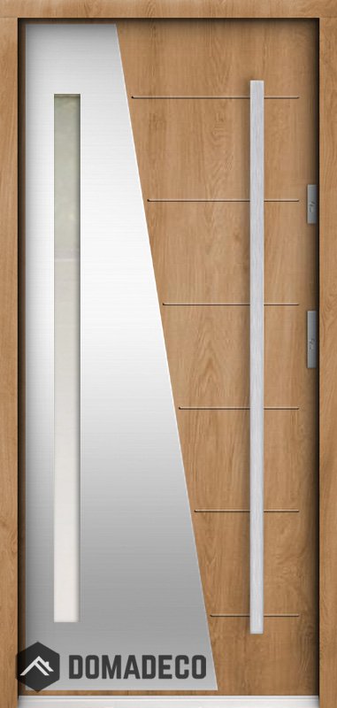 De deur is gemaakt van roestvrij staal. Binnenin is het gevuld met PUR-polyurethaanschuim en hout. De dikte van het deurblad is 55mm. Dubbel afdichtingssysteem - één afdichting bevindt zich in de opening van het kozijn en de andere bevindt zich in het ondersteunende deel van het deurblad. Dit vermindert trillingen en beschermt jouw huis tegen warmteverlies. Het volume verandert niet vonder invloed van atmosferische omstandigheden. Het kozijn heeft in de scharnierdelen en de vergrendelingspunten anti-inbraakversterkingen.