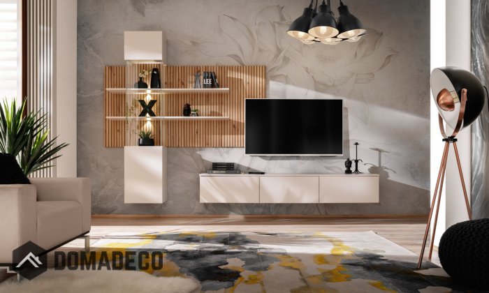 Decoratieve panelen – gegroefd, met zwarte inzetstukken (print die latten imiteert), wat het geheel een modern 3D-paneeleffect geeft.
