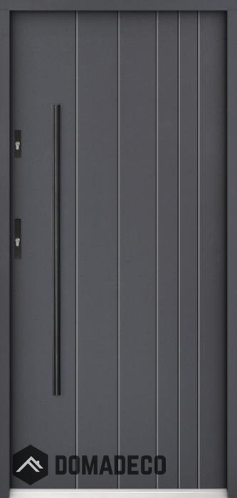 De deur is gemaakt van roestvrij staal. Binnenin is het gevuld met PUR-polyurethaanschuim en hout. De dikte van het deurblad is 55mm. Dubbel afdichtingssysteem - één afdichting bevindt zich in de opening van het kozijn en de andere bevindt zich in het ondersteunende deel van het deurblad. Dit vermindert trillingen en beschermt jouw huis tegen warmteverlies. Het volume verandert niet vonder invloed van atmosferische omstandigheden. Het kozijn heeft in de scharnierdelen en de vergrendelingspunten anti-inbraakversterkingen.