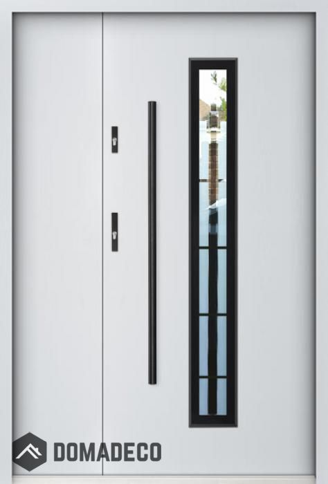 De deur is gemaakt van roestvrij staal. Binnenin is het gevuld met PUR-polyurethaanschuim en hout. De dikte van het deurblad is 55mm. Dubbel afdichtingssysteem - één afdichting bevindt zich in de opening van het kozijn en de andere bevindt zich in het ondersteunende deel van het deurblad. Dit vermindert trillingen en beschermt jouw huis tegen warmteverlies. Het volume verandert niet vonder invloed van atmosferische omstandigheden. Het kozijn heeft in de scharnierdelen en de vergrendelingspunten anti-inbraakversterkingen.