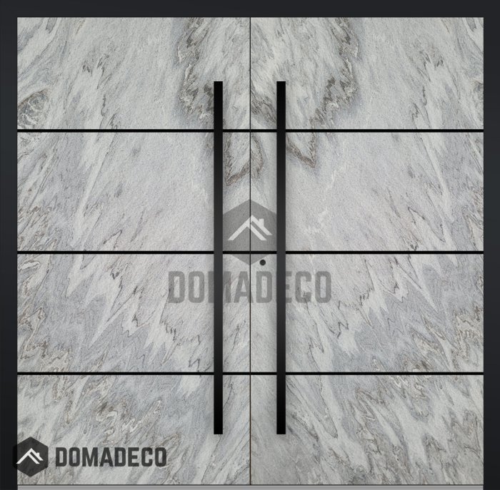 Die Türfüllungen bestehen aus gesintertem Quarz. Obwohl Quarzsinter in der Natur nicht vorkommt, besteht die Technologie zu seiner Gewinnung im Mischen und Pressen von u. a. Schieferton, Quarzsand und Granitgestein. Die auf diese Weise hergestellte Mischung wird durch Brennen gehärtet. Türfüllungen aus gesintertem Quarz haben einen industriellen, urbanen Stil und verweisen gleichzeitig auf exklusive und elegante Innenräume.