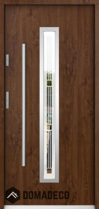 De deur is gemaakt van roestvrij staal. Binnenin is het gevuld met PUR-polyurethaanschuim en hout. De dikte van het deurblad is 55mm. Dubbel afdichtingssysteem - één afdichting bevindt zich in de opening van het kozijn en de andere bevindt zich in het ondersteunende deel van het deurblad. Dit vermindert trillingen en beschermt jouw huis tegen warmteverlies. Het volume verandert niet vonder invloed van atmosferische omstandigheden. Het kozijn heeft in de scharnierdelen en de vergrendelingspunten anti-inbraakversterkingen.