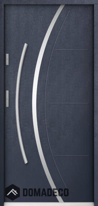 De deur is gemaakt van roestvrij staal. Binnenin is het gevuld met PUR-polyurethaanschuim en hout. De dikte van het deurblad is 55mm. Dubbel afdichtingssysteem - één afdichting bevindt zich in de opening van het kozijn en de andere bevindt zich in het ondersteunende deel van het deurblad. Dit vermindert trillingen en beschermt jouw huis tegen warmteverlies. Het volume verandert niet vonder invloed van atmosferische omstandigheden. Het kozijn heeft in de scharnierdelen en de vergrendelingspunten anti-inbraakversterkingen.