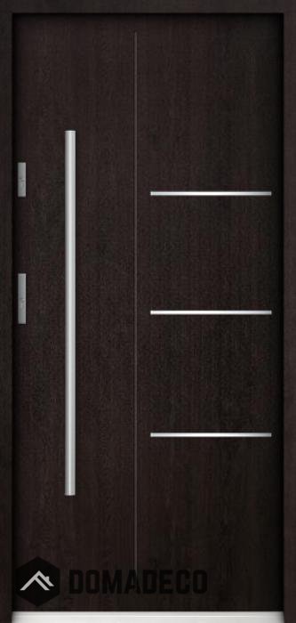 De deur is gemaakt van roestvrij staal. Binnenin is het gevuld met PUR-polyurethaanschuim en hout. De dikte van het deurblad is 55mm. Dubbel afdichtingssysteem - één afdichting bevindt zich in de opening van het kozijn en de andere bevindt zich in het ondersteunende deel van het deurblad. Dit vermindert trillingen en beschermt jouw huis tegen warmteverlies. Het volume verandert niet vonder invloed van atmosferische omstandigheden. Het kozijn heeft in de scharnierdelen en de vergrendelingspunten anti-inbraakversterkingen.