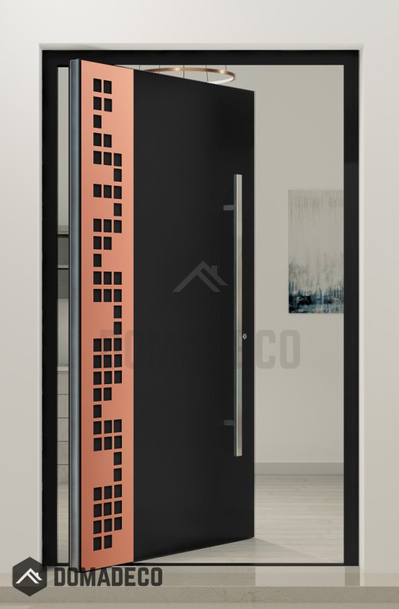 PIVOT C27 - aluminium draaideur bekleed met koperplaat met uitgesneden vierkanten