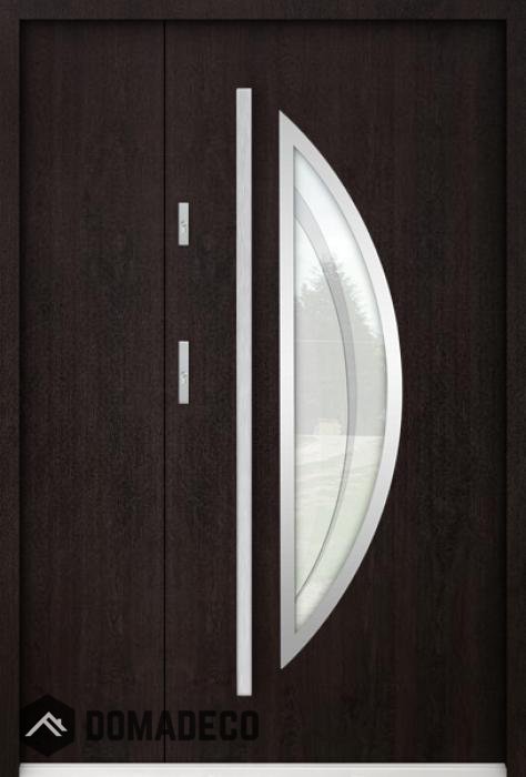 De deur is gemaakt van roestvrij staal. Binnenin is het gevuld met PUR-polyurethaanschuim en hout. De dikte van het deurblad is 55mm. Dubbel afdichtingssysteem - één afdichting bevindt zich in de opening van het kozijn en de andere bevindt zich in het ondersteunende deel van het deurblad. Dit vermindert trillingen en beschermt jouw huis tegen warmteverlies. Het volume verandert niet vonder invloed van atmosferische omstandigheden. Het kozijn heeft in de scharnierdelen en de vergrendelingspunten anti-inbraakversterkingen.