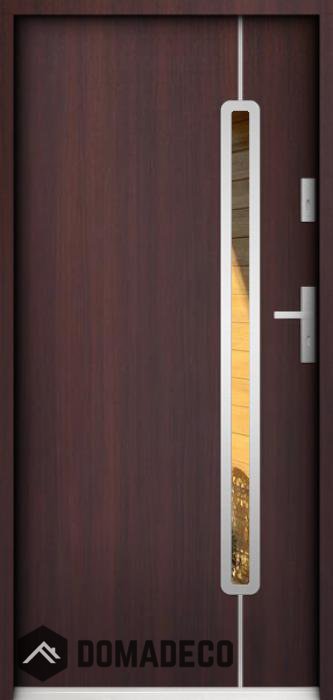 De deur is gemaakt van roestvrij staal. Binnenin is het gevuld met PUR-polyurethaanschuim en hout. De dikte van het deurblad is 55mm. Dubbel afdichtingssysteem - één afdichting bevindt zich in de opening van het kozijn en de andere bevindt zich in het ondersteunende deel van het deurblad. Dit vermindert trillingen en beschermt jouw huis tegen warmteverlies. Het volume verandert niet vonder invloed van atmosferische omstandigheden. Het kozijn heeft in de scharnierdelen en de vergrendelingspunten anti-inbraakversterkingen.