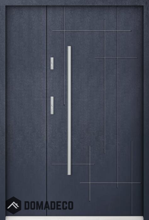De deur is gemaakt van roestvrij staal. Binnenin is de deur gevuld met PUR-schuim (polyurethaanschuim) en hout. De dikte van het deurblad is 55mm. Dubbel afdichtingssysteem - één afdichting bevindt zich in de deuropening van het kozijn en de andere bevindt zich in het ondersteunende deel van het deurblad. Ze verminderen trillingen en beschermen jouw huis tegen warmteverlies. Ze veranderen hun volume niet onder invloed van atmosferische omstandigheden. Het deurkozijn is in de scharnierdelen en de vergrendelingspunten voorzien van inbraakwerende verstevigingen.