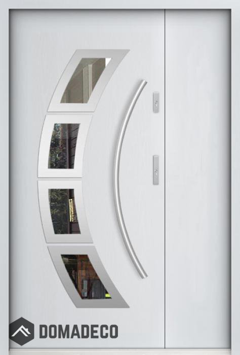 De deur is gemaakt van roestvrij staal. Binnenin is het gevuld met PUR-polyurethaanschuim en hout. De dikte van het deurblad is 55mm. Dubbel afdichtingssysteem - één afdichting bevindt zich in de opening van het kozijn en de andere bevindt zich in het ondersteunende deel van het deurblad. Dit vermindert trillingen en beschermt jouw huis tegen warmteverlies. Het volume verandert niet vonder invloed van atmosferische omstandigheden. Het kozijn heeft in de scharnierdelen en de vergrendelingspunten anti-inbraakversterkingen.