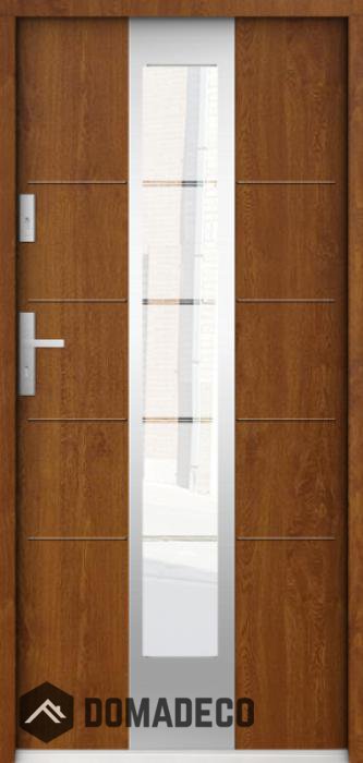 De deur is gemaakt van roestvrij staal. Binnenin is het gevuld met PUR-polyurethaanschuim en hout. De dikte van het deurblad is 55mm. Dubbel afdichtingssysteem - één afdichting bevindt zich in de opening van het kozijn en de andere bevindt zich in het ondersteunende deel van het deurblad. Dit vermindert trillingen en beschermt jouw huis tegen warmteverlies. Het volume verandert niet vonder invloed van atmosferische omstandigheden. Het kozijn heeft in de scharnierdelen en de vergrendelingspunten anti-inbraakversterkingen.